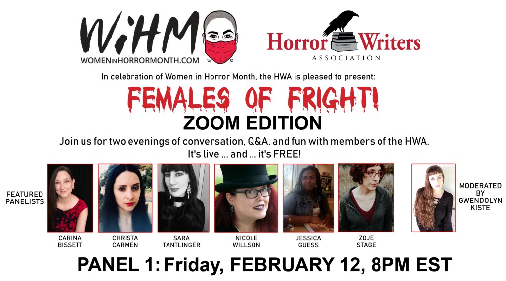 Carina Bissett will be discussing her approach to horror at the online panel Females of Fright!, hosted by the Horror Writers Association. She will be joining the conversation with Christa Carmen, Sara Tantlinger, Nicole Willson, Jessica Guess, and Zoje Stage. The online event is scheduled to be held on Friday, February 12 at 6 pm (Mountain Time). This first panel in the series celebrating WIMH will be moderated by award-winning author Gwendolyn Kiste. Registration is free and open to the public. Sign up HERE. (Note: The panel can be accessed at the HWA’s YouTube channel.)