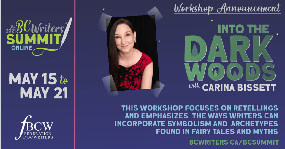 In other news, Carina is making a guest appearance at the BC Writers’ Summit next month. Her workshop “Into the Dark Woods” will focus on fairy tale retellings and the ways writers can incorporate mythic archetypes and symbolism in their own work. “Into the Dark Woods” is scheduled to begin at 7 pm (Pacific Time) on Sunday, May 16.