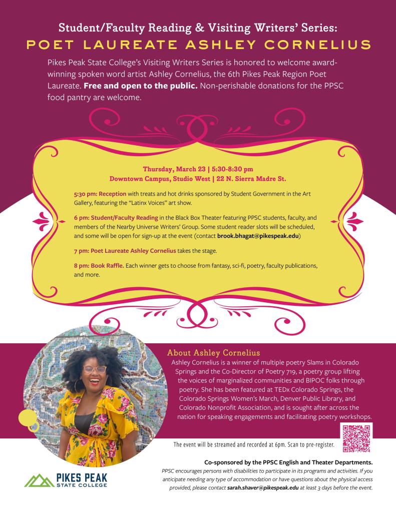 Pikes Peak Poet Laureate Ashley Cornelius is coming to PPSC on Thurs., Mar. 23! Ashley is an award-winning, nationally recognized spoken word artist and speaker committed to using her voice to uplift marginalized communities. The evening will begin with refreshments and hot drinks at 5:30 in the Art Gallery at Studio West downtown–get your raffle ticket and check out the “Latinx Voices” art show. 6 pm- student open mic and reading with student/faculty/Nearby Universe authors in the Studio West black box theater; 7 pm- Ashley Cornelius takes the stage! 8 pm- book raffle. Winners get to choose from fantasy, sci-fi, poetry, and signed books by faculty and Nearby Universe authors. Free and open to the public. If you can’t make it in person, we’ll be streaming, too–scan the QR code on the flyer to pre-register. Join us!