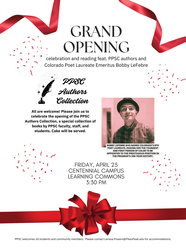 Please join us Friday, April 25th at 3:30 pm in the Centennial Campus Learning Commons for the Grand Opening Celebration of the PPSC Authors Collection. The reading will feature PPSC authors, very fancy bookmarks, a plaque (or a sculpture or something), and Colorado Poet Laureate Emeritus Bobby LeFebre. Needless to say, there will be cake.
