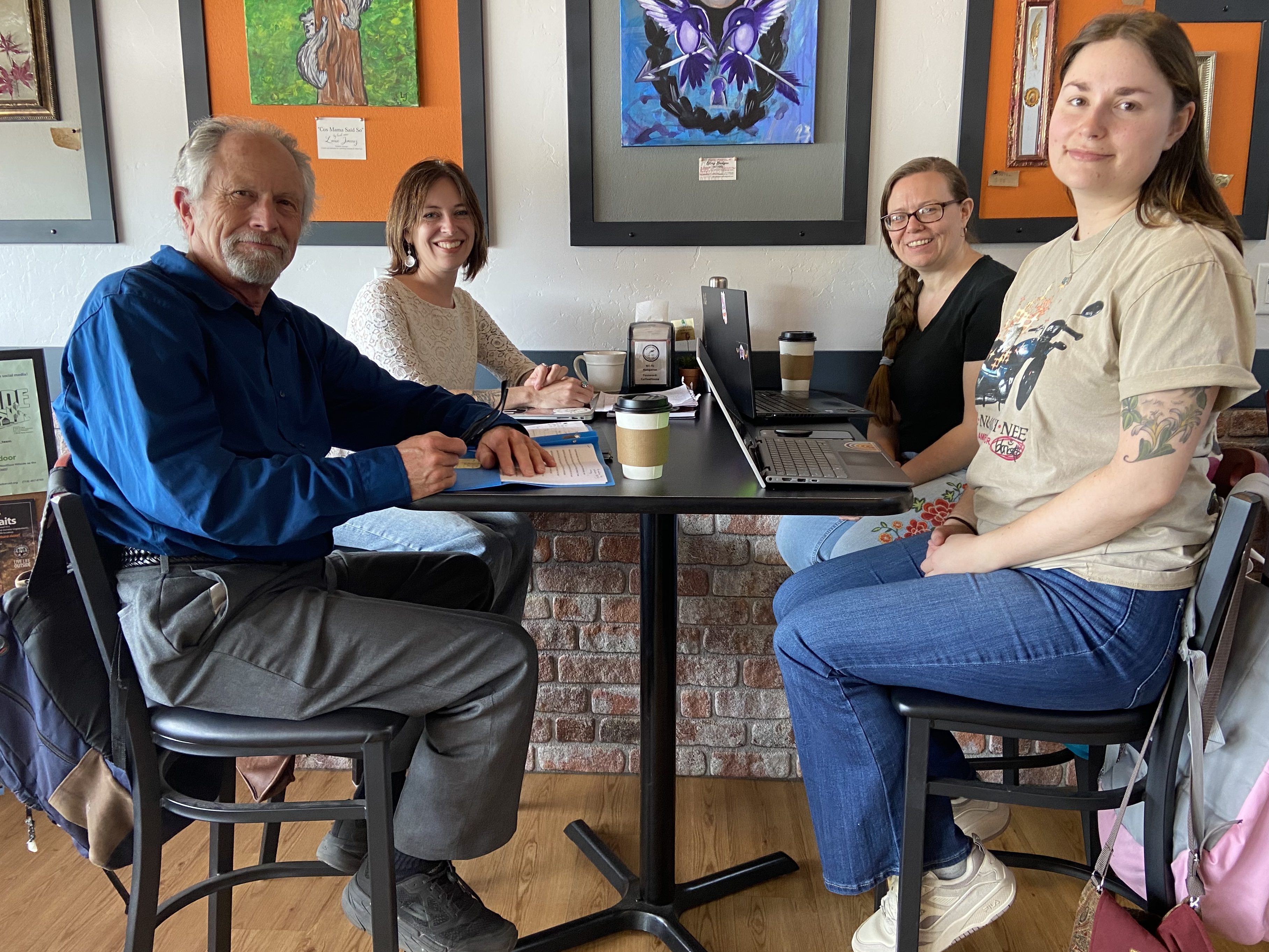 Between semesters, Nearby Universe members love to engage in parallel play! Richard, Amber, Madeline, and Brook attended our spring write-in, where they worked on memoirs, poetry, a novel, fiction, and a hazelnut latte, respectively.