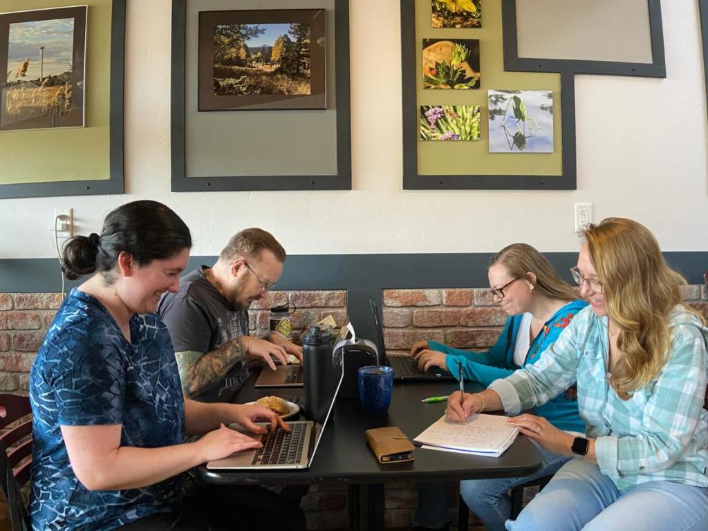 From left: sci-fi, fantasy, poetry, and pickleball life lessons–aka Sage, Jackal, Brook, and Brooke. We wrote for hours and enjoyed coffeehouse jazz, desserts, and fancy coffee drinks, jibber-jabbering about writing and our works-in-progress. What a fantastic way to celebrate the new year, our imaginations, and our amazing writing community!