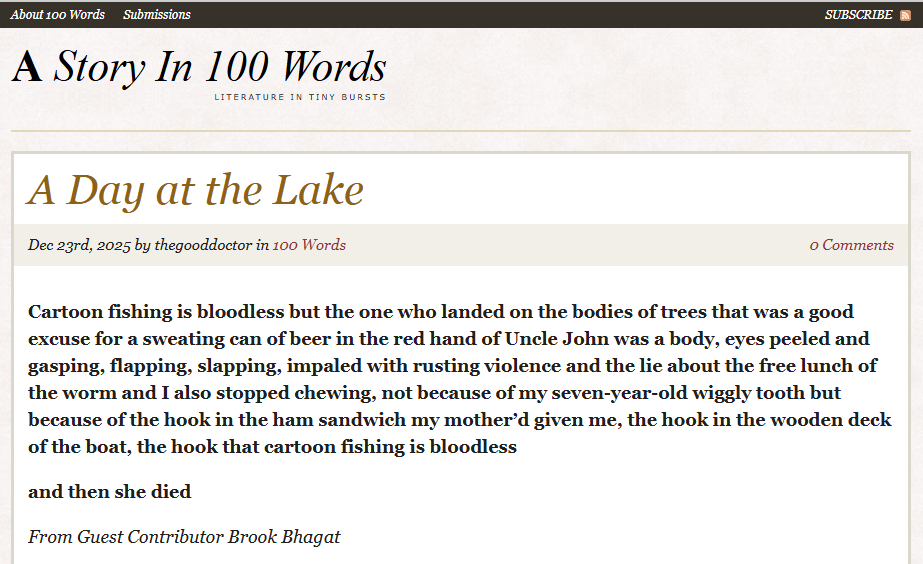 Brook Bhagat is happy to share that her prose poem, “A Day at the Lake,” was published on A Story in 100 Words. The piece was written in a fantastic workshop on Ecopoetry led by poet brice maiurro at the Castle Rock Writers’ Conference, which several members of the Nearby Universe attended in August. The poem appears here on A Story in 100 Words: A Day at the Lake