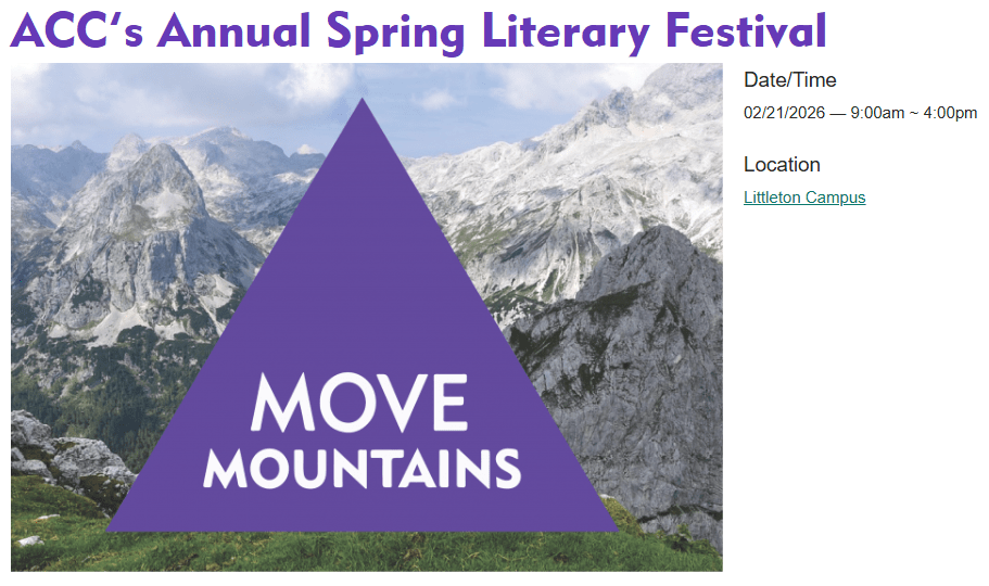Brook Bhagat is honored to be facilitating a writing workshop and reading her poetry at the ACC Litfest! The Arapahoe Community College Writers’ Studio full-day conference, open to students and community members, will take place on Saturday, February 21, from 9 am to 4 pm in Littleton, Colorado. At $30 for CCCS students and a bit more for the public, it’s absolutely “the most affordable, quality-laden literary festival you will find, for writers of all levels and ages.” That $30 includes lunch, as well as author readings and signings from luminaries like Teague Bohlen, Erika T. Wurth, and Steven Dunn.
